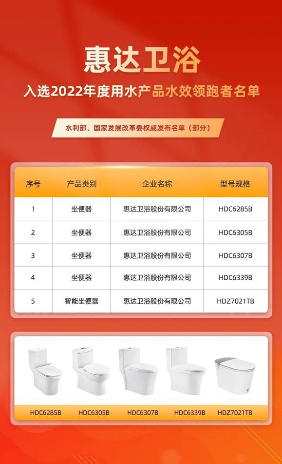 2023年,惠達5款馬桶入選水利部辦公廳、國家發展改革委辦公廳發布的“2022年度用水產品水效領跑者”名單。